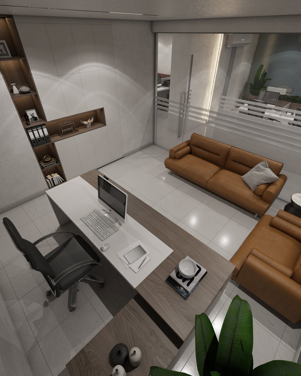 Premium Materials: A refined contrast of sleek white marble flooring and warm cognac leather seating.