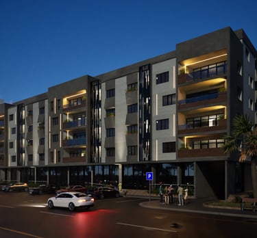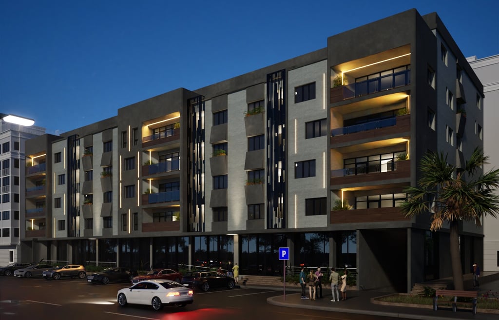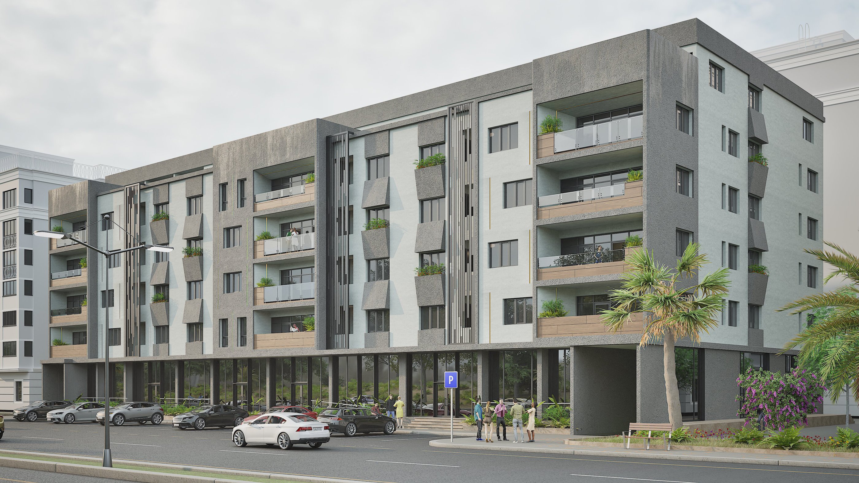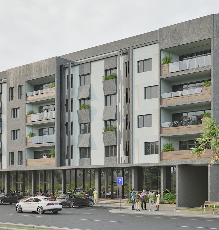This contemporary mixed-use landmark blends industrial sophistication with natural warmth. Designed for Oman’s rising economic hub, the building features premium glass-fronted commercial spaces on the ground floor and high-end residential units above.